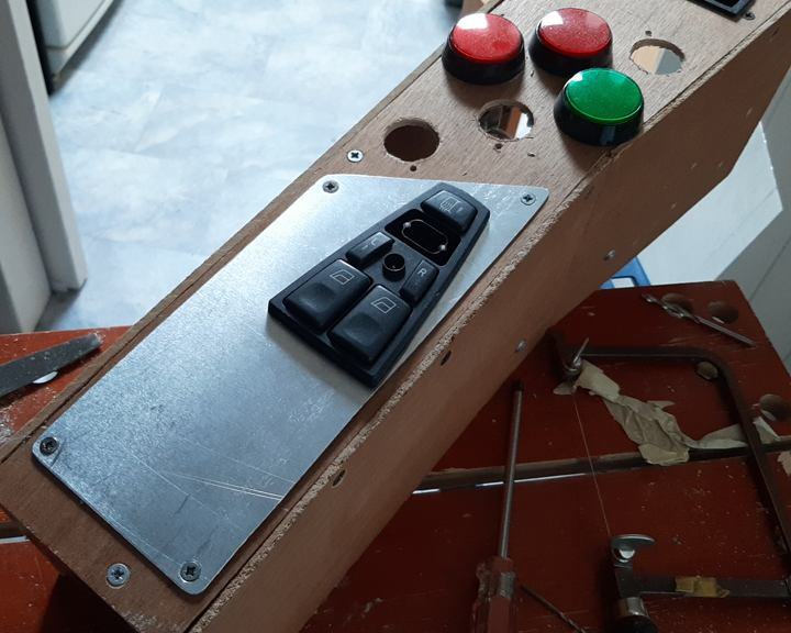 Begin 2022 kocht ik enkele vrachtwagenonderdelen, dit keer van een Nederlandse onderdelenhandelaar (Basparts.com), waar ook een spiegelafstel en raam-module bij zat (om ramen te openen en sluiten). Deze wilde ik ook aan kunnen sluiten, maar daarvoor moest ik eerst een gat uitzagen. Deze module was echter bedoeld om ingepast te worden in een gat van een dunne plaat. De 4mm dikke bovenplaat was hiervoor te dik. Daarom zaagde ik een gat uit een stuk aluminium dat ik eerder op maat zaagde.