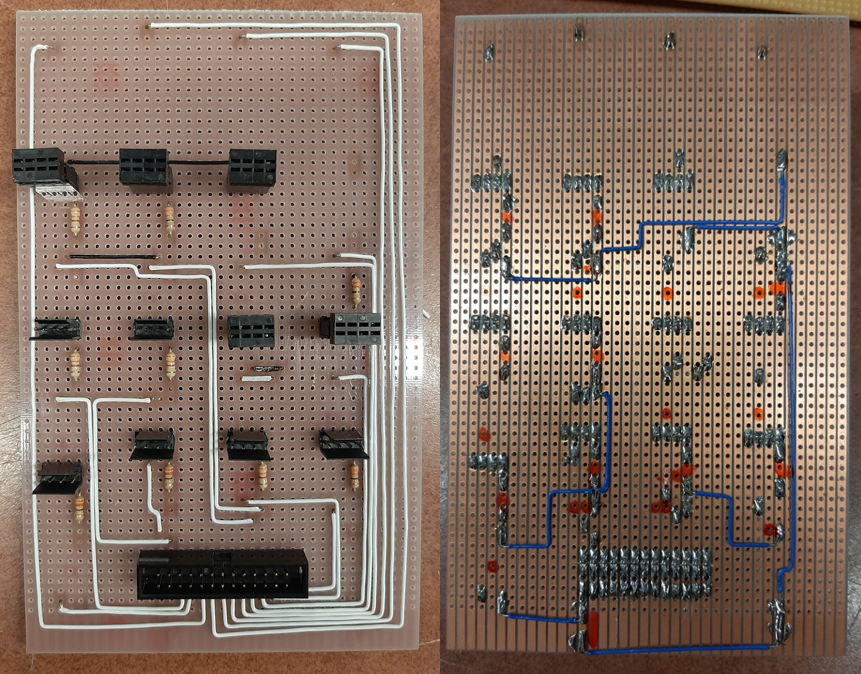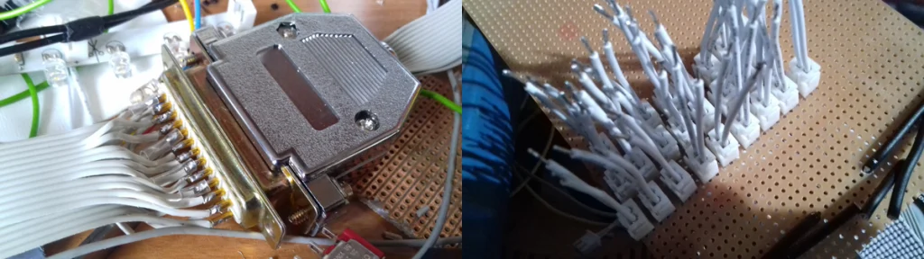 Die beslissing wreekte zich snel, ook omdat ik 2 pins stekkertjes gebruikte om knoppen te verbinden en deze zéér dicht op elkaar soldeerde, op wat uiteindelijk de hoofdprint had moeten worden. Als je er 1 lostrok, kon je er bijna niet meer bij om ‘m weer in te pluggen. De verbinding met die print verliep via een DB25 connector.