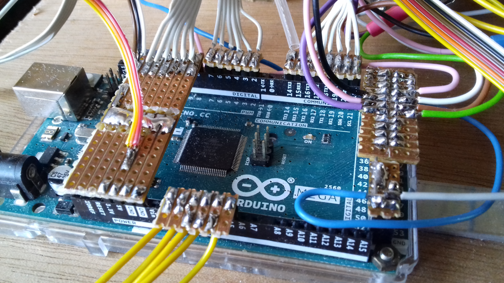 In dit stadium gebruikte ik de Arduino Mega ook voor stuur-bewegingen en pedalen. Dat zijn de gele draden onderin en is waar in de foto van de onderzijde van de zijconsole de potmeter voor bedoeld was. Dit betrof een 10-slags potmeter, zodat een grote hoeveelheid omwentelingen van het stuur zelf mogelijk zouden zijn. De dikke roze, bruine, zwarte, groene, paarse, witte en zwarte draden rechts zijn van de deurknoppen die ik uiteindelijk verhuiste naar andere pinnen.