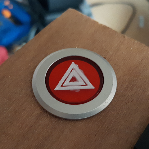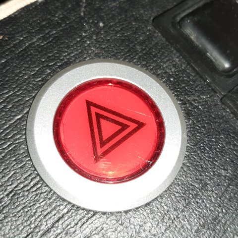 Omdat ik de schakelaar voor de waarschuwingslichten (die bij sommige van deze bussen vlak voor de richtingaanwijzerhendel zat en bestond uit een piepklein pookje) niet zelf wist te maken gebruikte ik de rode EAO schakelaar die ik van m’n werk meekreeg en monteerde deze links-voor in de zijconsole. Mijn laserprinter kan helaas niet wit printen, dus probeerde ik eerst 2 driehoeken te printen in PETG. Deze probeerde ik vervolgens op de lens te lijmen. Een dag later raakte ik deze aan en sprongen de driehoekjes er onmiddellijk vanaf. Uiteindelijk ging ik ook hier maar voor transparanten.