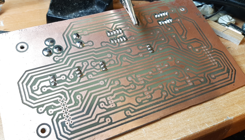 Na het etsen (ik vergat een foto te maken van na het etsen) verwijder je met aceton de toner van de plekken die niet geëtst hoefden te worden, zodat je straks goed kunt solderen. Hierna is het tijd om gaatjes te boren om de onderdelen te plaatsen. Dat kan je het beste doen met een kleine kolomboormachine. In de onderstaande foto waren de gaatjes al allemaal uitgeboord en had ik al enkele onderdelen geplaatst.
