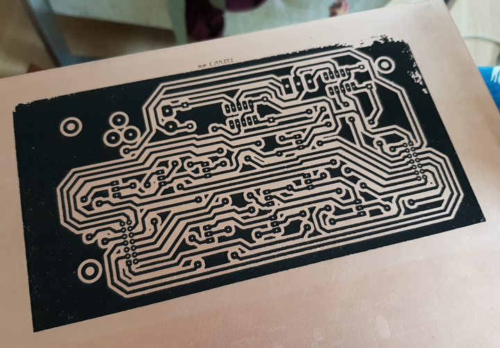 Met PCB transfer vellen, geprint op de laserprinter streek ik het printontwerp over op een stuk enkelzijdig epoxy en zaagde daarna de koperrestanten af. Het grote zwarte vlak in het ontwerp helpt louter bij het etsen: het proces wordt vertraagd naarmate er meer koper wordt weggevreten, dus de vloeistof zo schoon mogelijk houden komt de snelheid ten goede.