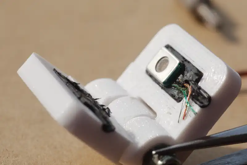 Hoewel het aan jouw is om te bepalen hoe je de behuizing sluit, kun je het op twee manieren doen. Bij het eerste microfoontje schroeide ik de behuizing dicht door een stukje nikkel-strip aan de soldeerbout vast te maken (je wilt immers je bout schoon houden). Hoewel dit werkt, kan de buitenkant van het microfoontje hierdoor wat onregelmatig ogen en aanvoelen. Sommige accessoires van dit microfoontje passen daardoor niet goed.