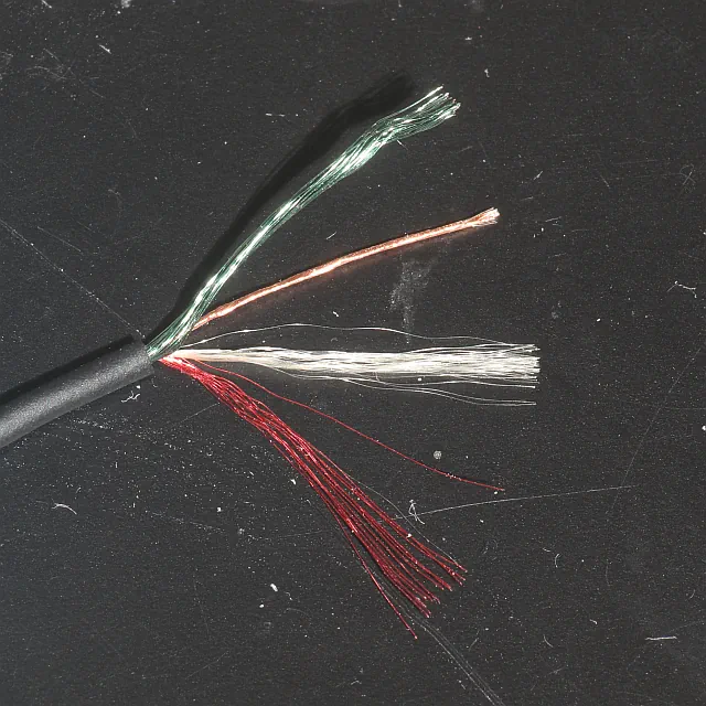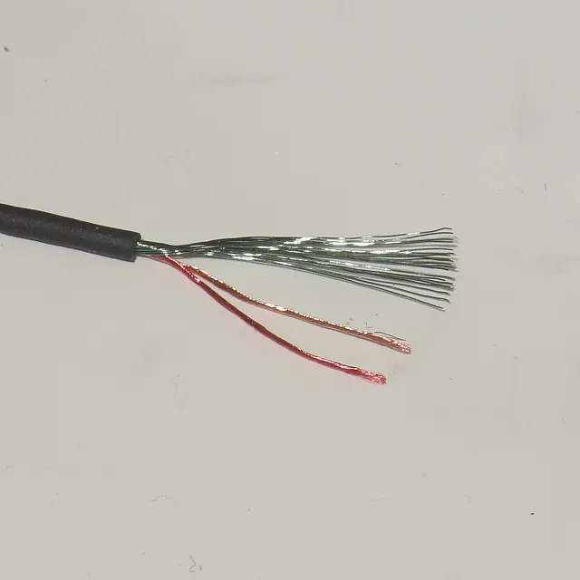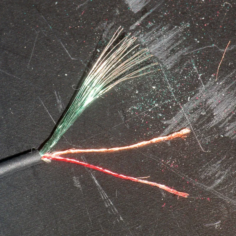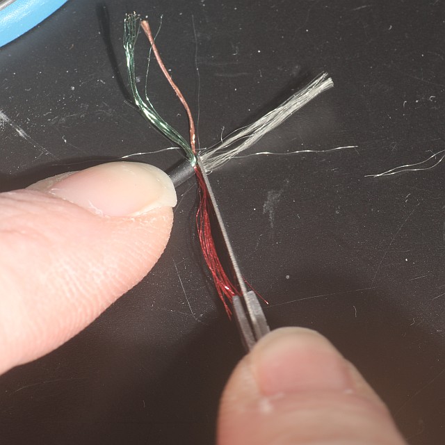 De algemene isolatie aangestript heb je 3 verschillende aders. De rode en koperkleurige draad (en soms de groene, het lijkt tussen batches van deze microfoontjes te verschillen) bevatten een nylon wikkelhulp als kern. Deze moet je weghalen, anders vervuilt deze de soldeerverbinding en maakt het aanzetten van de draad lastig.