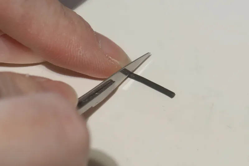 Het spuitgiet-rubber is vreselijk taai en vereist een goed, smal, mesje. Zelf gebruik ik een scalpel, nummer 3 van de BACO in IJmuiden. Omdat het elementje echt piepklein is, kan ik je echt afraden om dit zonder hulpmiddelen te doen.