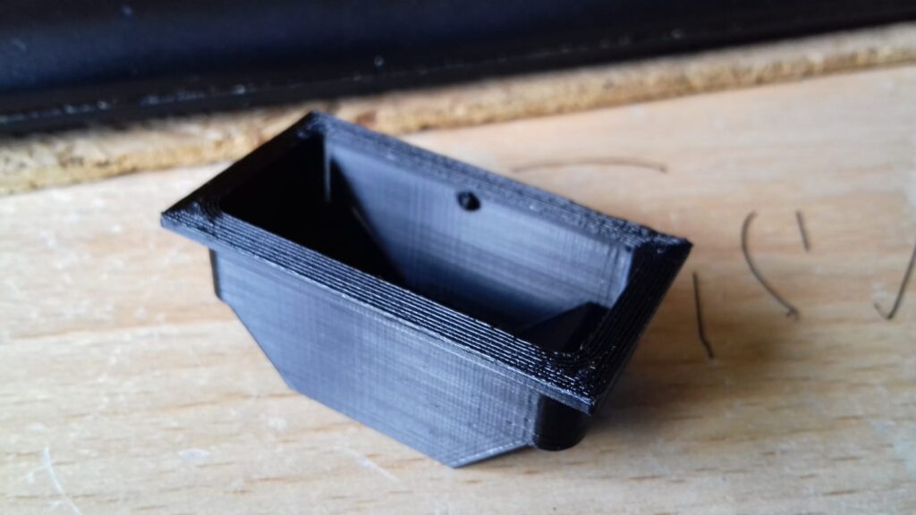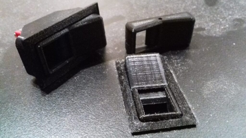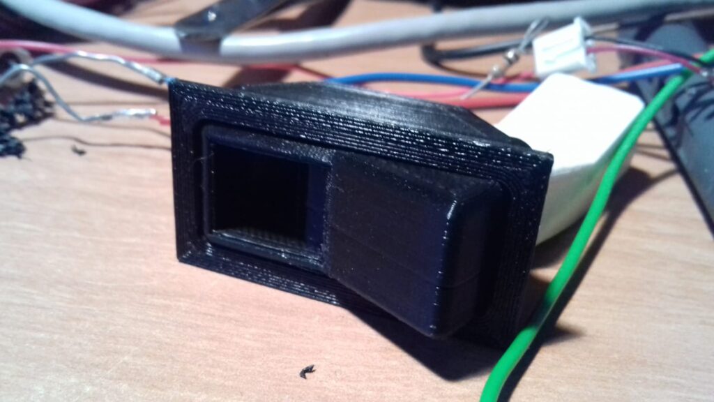 Na wat prutsen in Blender om een schakelaarhuis te creƫren waarin een gemakkelijk verkrijgbaar tuimelschakelaartje te plaatsen zou zijn was er een eerste prototype klaar om geprint te worden.